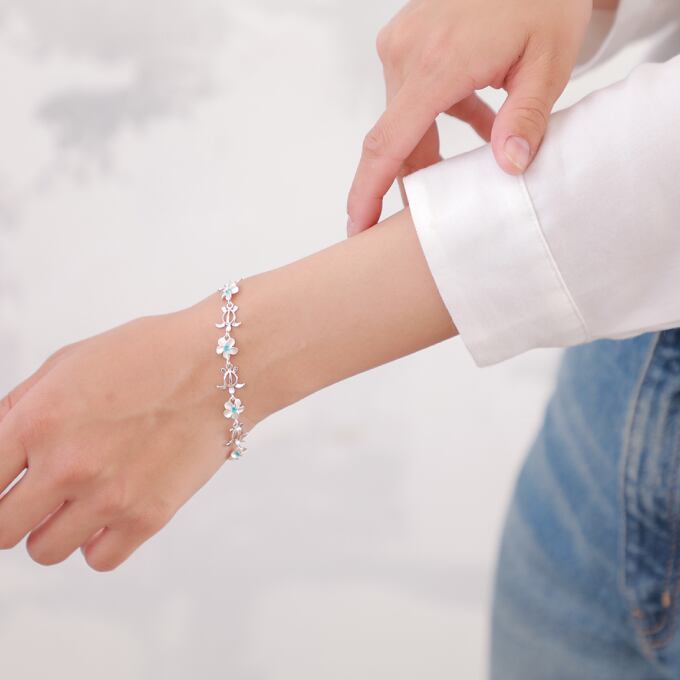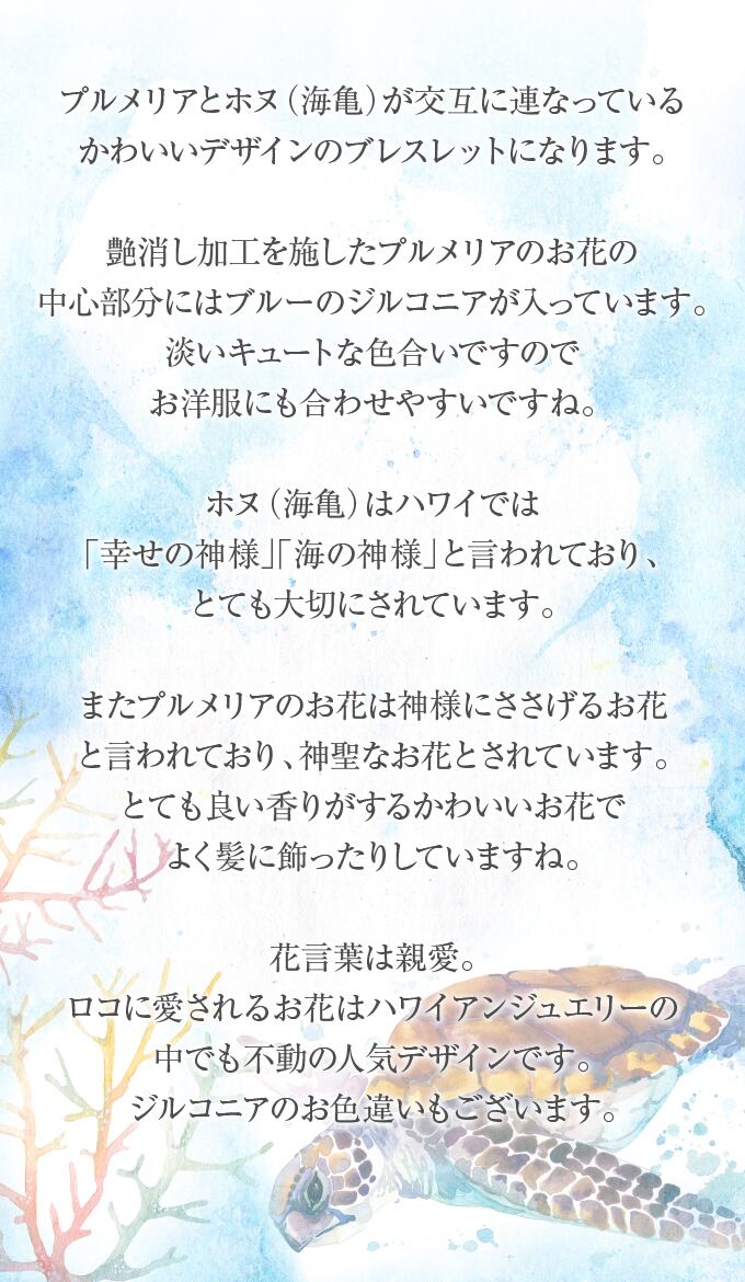 プルメリアのお花とホヌ(海亀)が交互に連なっているかわいいデザインのブレスレットになります。