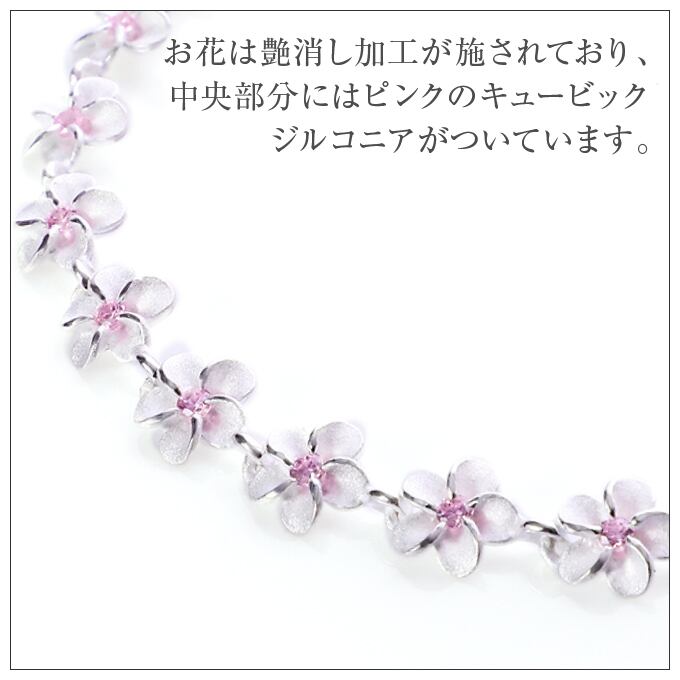 お花は艶消し加工が施されており、中央部分にはピンクのキュービックジルコニアがついています。