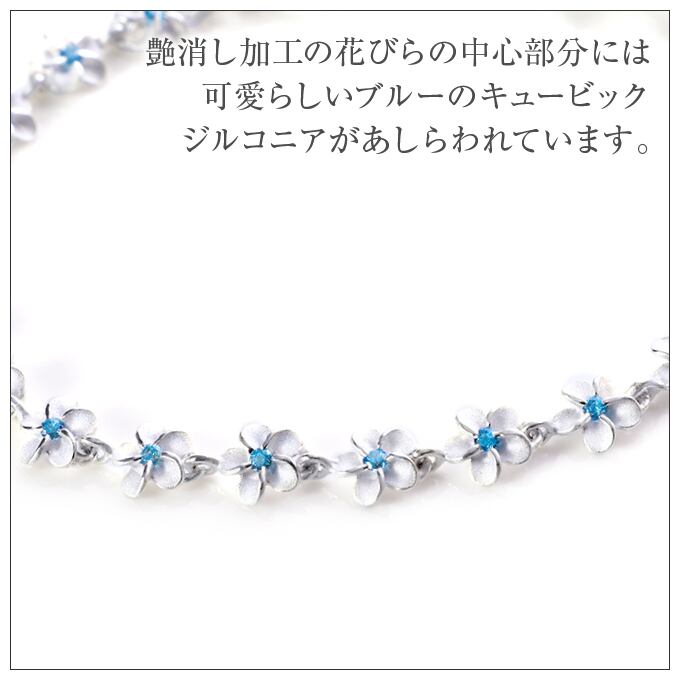 艶消し加工の花びらの中心部分には可愛らしいブルーのキュービックジルコニアがあしらわれています。