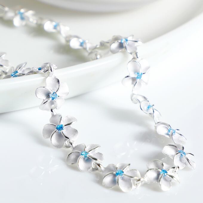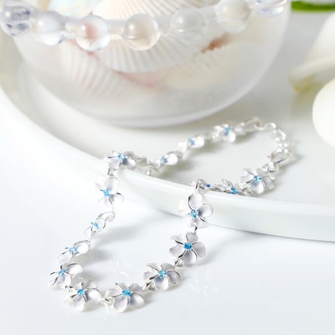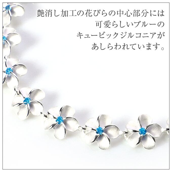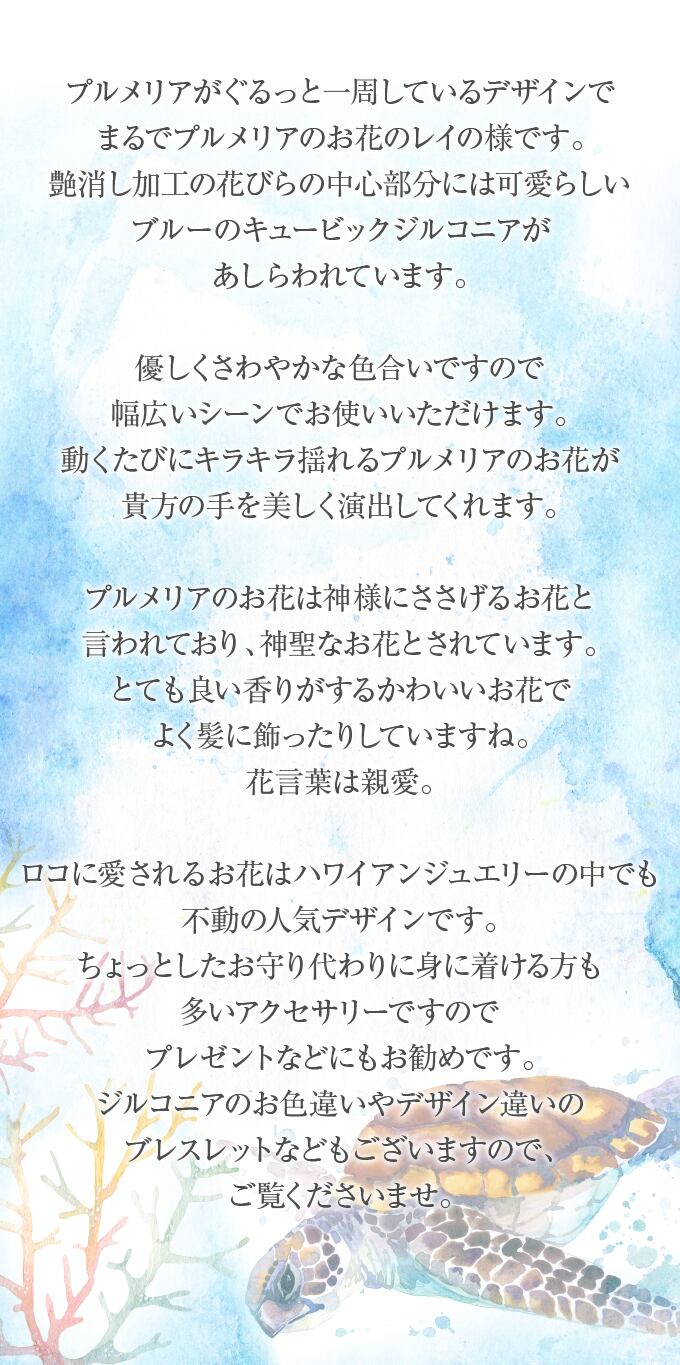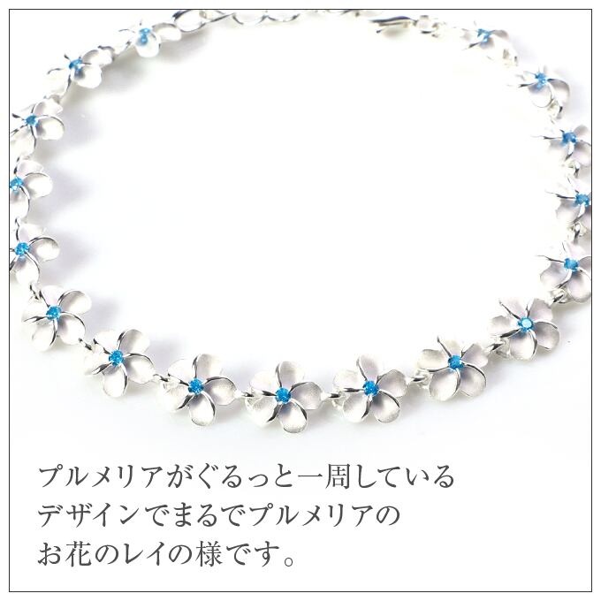 プルメリアがぐるっと一周しているデザインでまるでプルメリアのお花のレイの様です。艶消し加工の花びらの中心部分には可愛らしいブルーのキュービックジルコニアがあしらわれています。