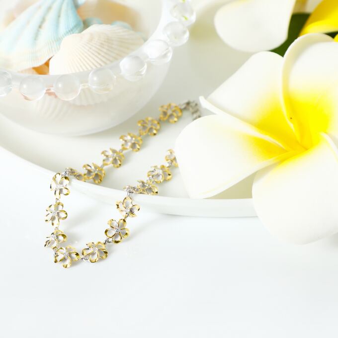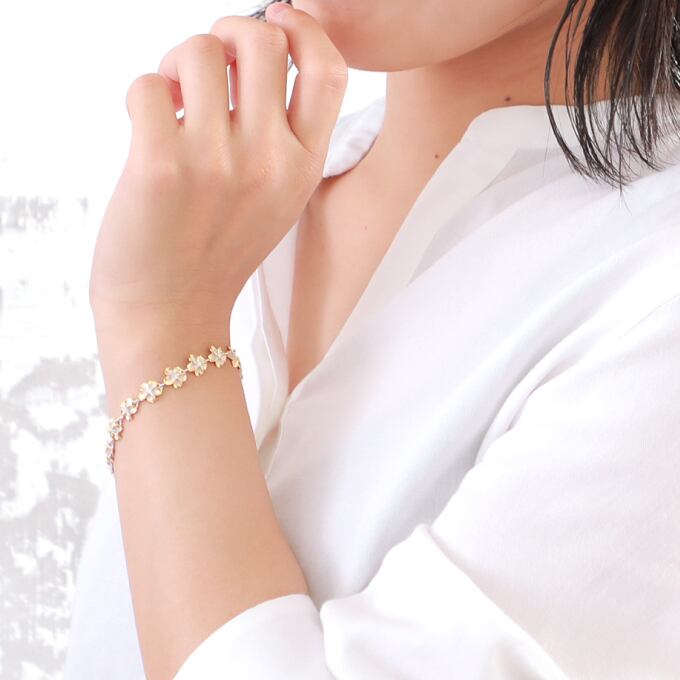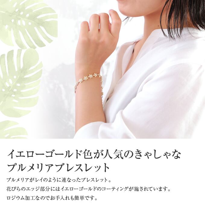 派手になりすぎず、肌なじみがいいので他のアクセサリーなどとも合わせやすいです。お花の中心部分にはそれぞれクリアカラーのキュービックジルコニアが入っています。動くたびにキラキラ揺れるプルメリアのお花が貴方の手を美しく演出してくれます。
