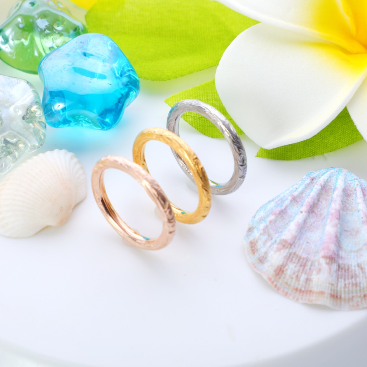 ハワイアンジュエリー リング 指輪 ペアリング 選べる3色 幅3ミリ レディース メンズ ペア サージカル ステンレス 316 シルバー イエローゴールド 24金 ピンクゴールド プルメリア 波 金属アレルギー プレゼント 送料無料 カップル ギフト
