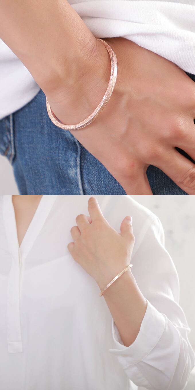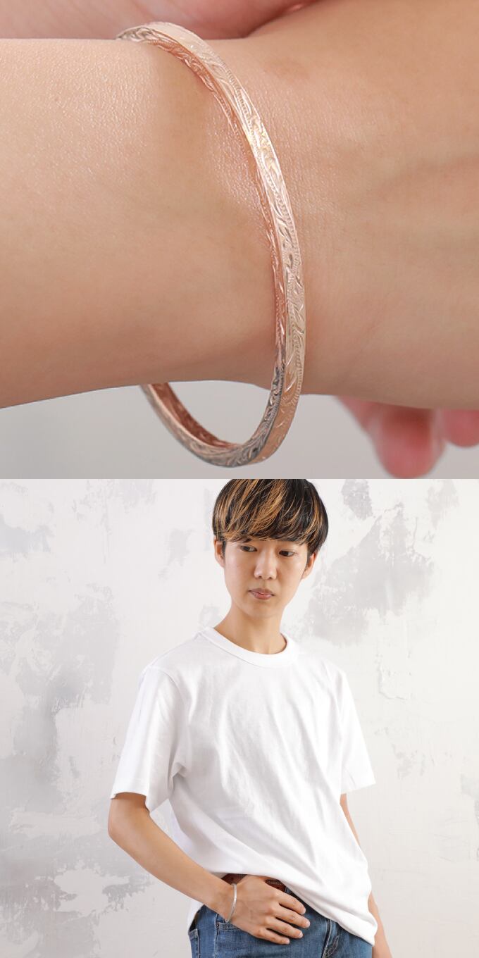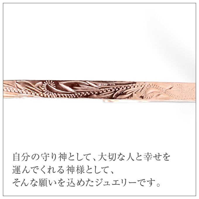 イエローゴールドカラーは、14金・18金が主流な中、あえてこだわって、高級な24金でメッキをしています。そのことで、ハワイアンジュエリーのバングルとしても、そして、金属アレルギーが起きにくく変色しにくいステンレスならではの特性を保つとともに、金本来の輝きをお楽しみいただけます。