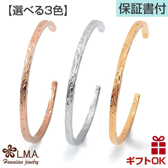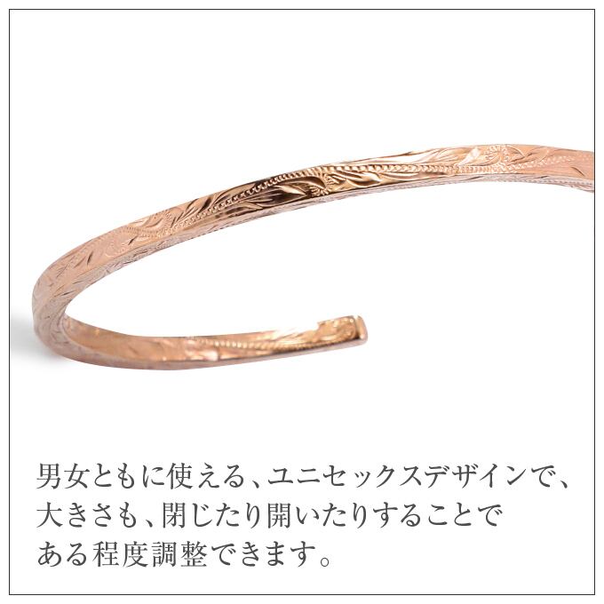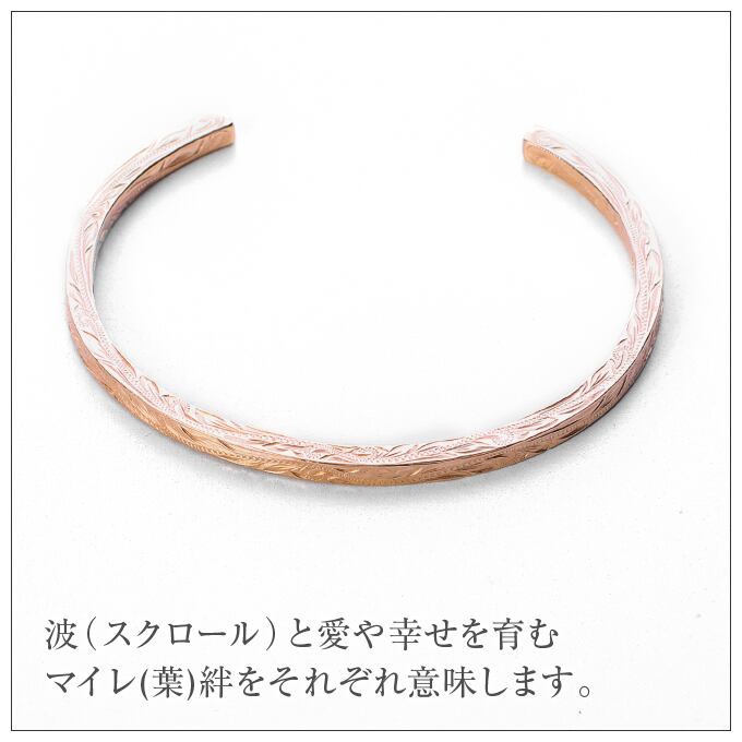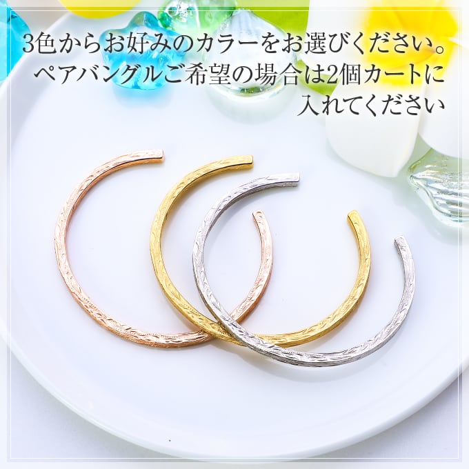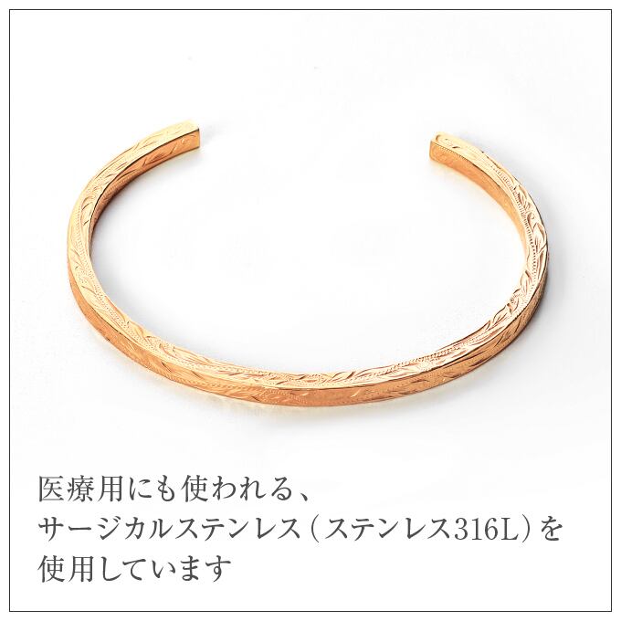 ハワイアンジュエリー バングル カーフ オープン サージカル ステンレス 316L 24金 ピンクゴールド 幅3mm スクエアバングル フリーサイズ 細め プルメリア 選べる3色 花 波 スクロール 金属アレルギー レディース プレゼント 誕生日 【送料無料】人気 ペアバングル カップル